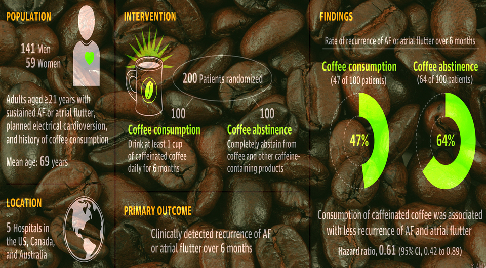 Кристофер Вон (Christopher Wong) из Калифорнийского университета в Сан-Франциско с коллегами провел проспективные открытые рандомизированные испытания DECAF в пяти клинических центрах трех стран. В них приняли участие 200 пациентов (средний возраст 69 лет, 71 процент — мужчины) с постоянной фибрилляцией предсердий или трепетанием предсердий с фибрилляцией в анамнезе, которым назначили плановую электрическую кардиоверсию. Все они на момент включения или в течение пяти лет до него регулярно употребляли кофе в среднем по семь чашек в неделю. После уcпешной кардиоверсии 100 участникам случайным образом рекомендовали ежедневно выпивать как минимум чашку не декофеинизированного кофе, остальным 100 — воздерживаться от употребления кофе и кофеиносодержащих продуктов.