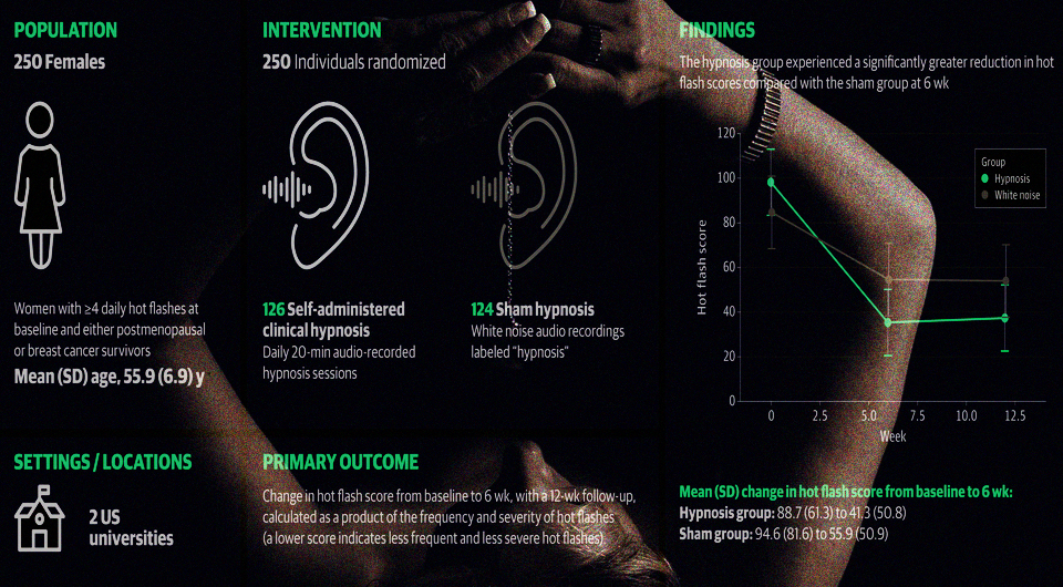 В рандомизированных контролируемых испытаниях приняли участие 250 женщин (средний возраст 55,9 лет, у 24,8 процента в анамнезе был рак груди), которые испытывали не менее четырех приливов в день или 28 приливов в неделю. После инструктажа половину из них снабдили 20-минутной аудиозаписью для ежедневного проведения клинического самогипноза, другую половину — белым шумом такой же продолжительности с подписью «гипноз» в качестве плацебо. Результаты опубликованы в журнале JAMA Network Open.