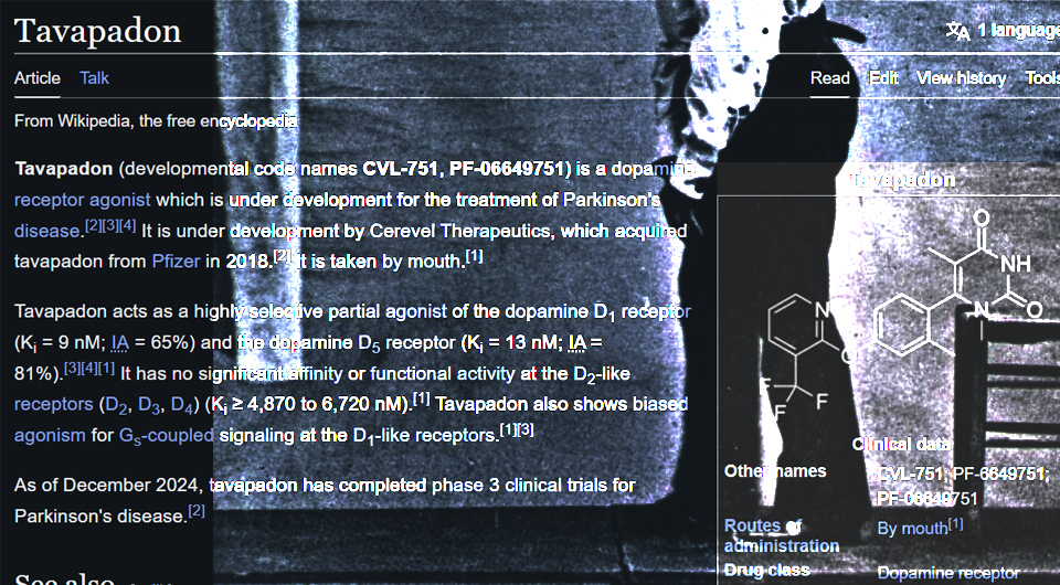 Исследовательская группа под руководством Золтана Мари (Zoltan Mari) из Центра здоровья мозга Лу Руво провела третью фазу клинического испытания тавападона — частичного селективного агониста рецепторов дофамина D1 и D5. Препарат принимается в виде таблетки один раз в день вместе с леводопой. Всего в исследовании приняли участие 507 человек с болезнью Паркинсона (средний возраст 64,9 года), в группу тавападона включили 252 человека, в группу плацебо — 255 человек. В общей сложности 142 участника прекратили участие в исследовании (93 в группе тавападона и 49 в группе плацебо).