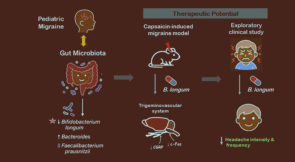 У детей с мигренью наблюдается сниженное содержание Bifidobacterium longum и повышенное распространение Bacteroides в микробиоме кишечника. При этом прием пробиотика с Bifidobacterium longum приводит к снижению продолжительности, интенсивности и частоты головных болей за счет снижения нейровоспаления в болевых центрах тройничного нерва. Результаты исследования опубликованы в журнале Gut Microbes.